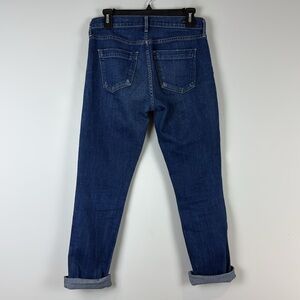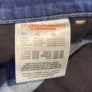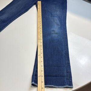 5 pockets. Unfinished hem that can be cuffed different ways.