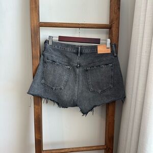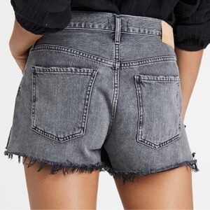 These are vintage-inspired shorts with a boyish fit and distressed hem. They're made with non-stretch, 100% cotton denim. This version comes in a washed black.