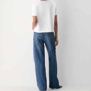 These are high-rise jeans with a wide, oversized leg that can be rolled up. They’re made in the USA from non-stretch 100% regenerative cotton denim with a soft drape.