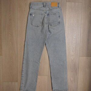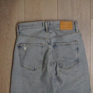 These are high-rise, wide-leg jeans designed for a relaxed, baggy fit. They’re made with non-stretch 100% cotton denim. These ones come in a light indigo wash.