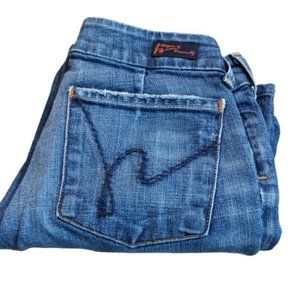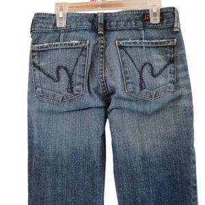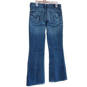 Citizens of Humanity By Jerome Dahan. Faye flared medium wash jeans. Distressed on tops of pockets and whiskering at top and around knee area.