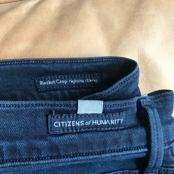 Citizens of Humanity High Rise Rocket Crop in 'Blue Print' (deep indigo). Size 27 waist. Distressed raw hem.