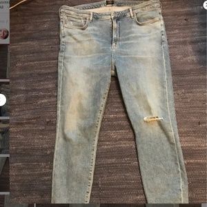 High Rise Skinny Cropped Jeans from Citizens of Humanity. Size 18W. Super-stretch Denim, ‘Distressed Serenity’ wash, light distressing. Button/zip fly, 5 pockets, rivets. 98% cotton, 2% Spandex. In very good used condition.
