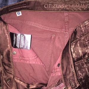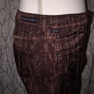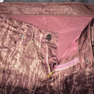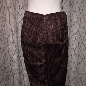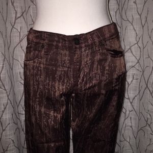 Citizens of Humanity pants, silk texture and feel but slightly thicker. Great pant for warmer weather, light weight. Features a wood grain look that will add that extra to any outfit. Skinny cut with some stretch to material.