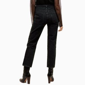 These stiff, washed black 100% cotton jeans are EUC. I had them hemmed to hit right above my ankle, I'm 5'3" for reference. As a result the inseam is about 24.5". I love these jeans but they just don't fit my hips and thighs quite right so it's time to let them go.