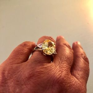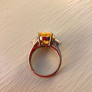 Want a conversation piece? 😍This beauty is high end crystals set in STERLING SILVER (marked inside). Approx 10 karats, centre stone is magnificently sparkly (looks like a yellow diamond) 2 lovely trillion cut crystal stones on either side. You gotta have this on your hand. Approx size 8.