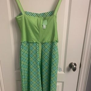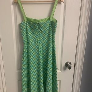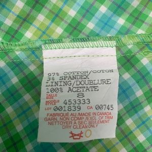 Beautiful dress made in Canada. Dress falls just below the knee. Seamless zipper located in the back and not visible when done up. Material is 97% cotton and 3% Spandex. Worn only a few times. There was a belt, however I cannot locate it. An easy fix to add any style of belt.