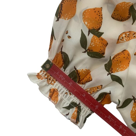 Summer short sleeve citrus print wrap dress for summer garden parties, cross over plunge neck line spring dress, size small, measurements are in photos. partially lined (see picture) Cream and orange with green leaves.
