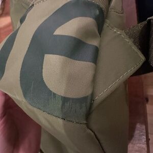 In used, good condition. Some wear along the bottom of the logo and seem, as seen in the pictures.