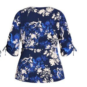 Take your style up a notch with the navy In Flight Top. This deep wrap v-neckline top features a peplum silhouette and gathered sleeves.