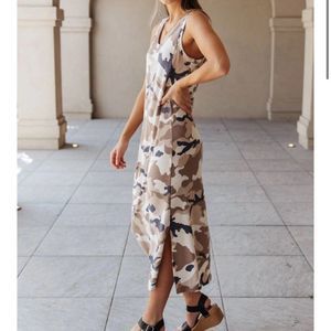 Stay cool and comfy in the City Camo Dress. Featuring wide straps and a mid calf length, this dress is perfect for running errands, or exploring a new city! Wear this neutral colored dress with your favorite gold accessories, or add a pop of color for a fun twist.