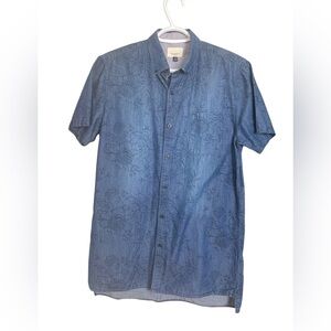This is in excellent used condition. Very lightweight so great for summer or a hot weather vacation. Light blue with black print. Meant to be worn untucked. It is slightly higher in the back than the front.