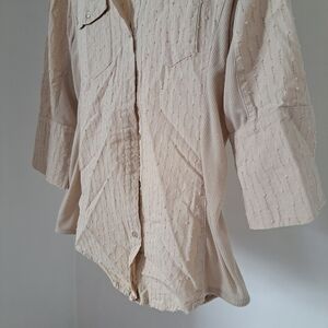 Cl sono | Beige - tan half sleeve women's casual v neck button blouse , with raised dot texture & t shirt sides. women's size large