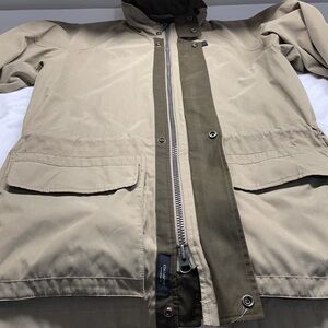 Features: full front zipper and snap front closure / 2 way zipper / double snaps at neck collar / 2 snaps at sleeve wrists / hidden hood disguised in back collar / drawstring toggle waist / 2 front pockets hook and loop closure / 1 zippered chest pocket / 2 deep interior pockets / mesh on upper 1/2 of lining