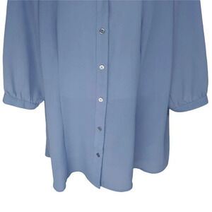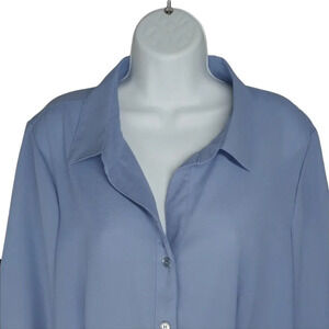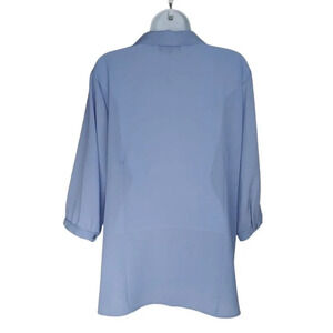 Pretty gray-blue (more blue than gray) button down blouse. Lightweight, semi sheer fabric. 3/4 length sleeves with button cuff. Collar. Open v-neck. Lots of tailoring for a great fit.