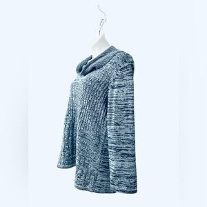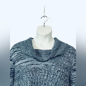 Embrace comfort and style with this plus-sized sweater featuring a cozy cowl neck and three-quarter sleeves. Its textured knit pattern in varying shades of blue creates a visually appealing effect, perfect for adding a touch of elegance to a casual outfit. Excellent condition 🫶 / 🚭