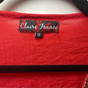 Claire France Women's Red boho peasant embroidered short sleeve gauzy top in 1X