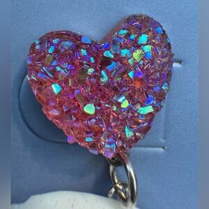 Claire’s sparkly post pierced earrings with heart tops with vibrant rainbow arcs and white glittery puffy clouds. Fun and playful design.