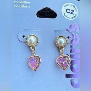 Charming Claire’s gold-tone earrings with faux pearls and pink cubic zirconia heart stones. Ideal for a chic look.