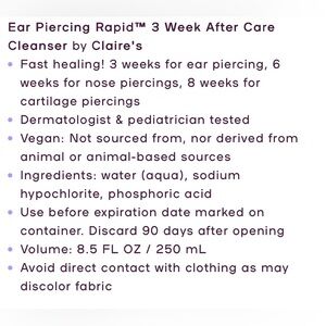 Claire's Rapid Aftercare Cleanser for newly pierced ears. Quick hygiene solution. 250 mL.