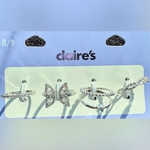 Claire’s elegant silver-tone 5 ring set. Includes butterfly design and faux rhinestones. Perfect for kids.