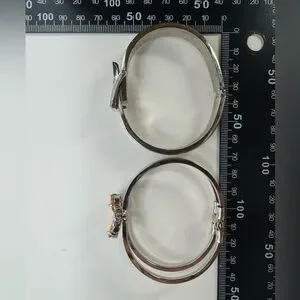 - a sleek silver tone design with a blue pattern leather (?) insert and a adjustable belt style clasp