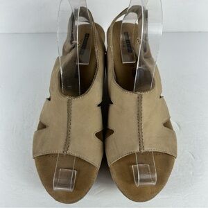 Step out in style with these chic tan wedge sandals. Perfect for any occasion, these shoes offer both comfort and elegance. In good used condition