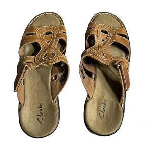 Clark s sandals ,Men size 7, Tan color,leather upper,slip on,velcro adjustable