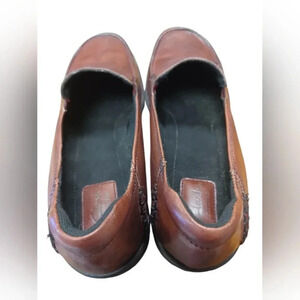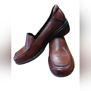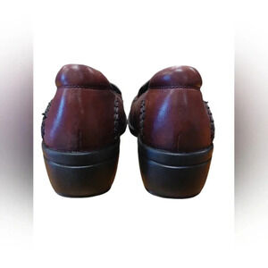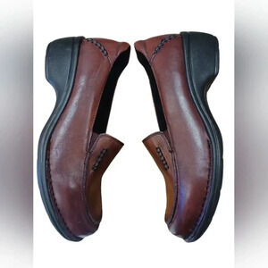 Oxblood red, these leather loafers feature a low heel and elastic darts for comfort.