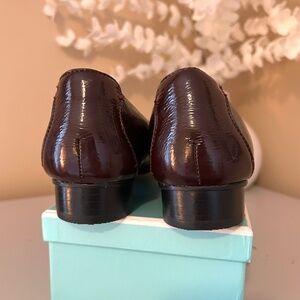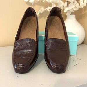 Clarks Artisan Collection, known for quality and comfort, these loafers in gorgeous burgundy patent leather are no exception! 3/4 Inch Heel. Molded Contour Cushion footbed offers unrivalled underfoot comfort. Flexible TR sole delivers ultimate underfoot traction. Artisan stitching details. No wear showing on these shoes, they are in pristine condition. Size 6 Medium width.