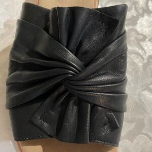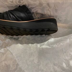 Clarks black leather women's sandals Size 9M, worn 3 times, in excellent condition, no rips or tears. Knot twist in front from Clarks Collection with a 1 1/2" platform, soft leather with a side gusset. Smoke free. home, all measurements are approximate.
