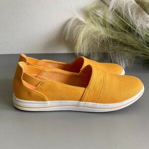 Women's Clarks Cloudstepper Breeze Step Casual Comfort Orange Shoes Sz 9. Features, pull on style, canvas upper, terry cloth lining, removable memory foam cushioned insoles, machine washable, rubber grip outsoles. In Excellent condition, No wear or flaws.