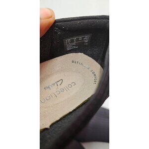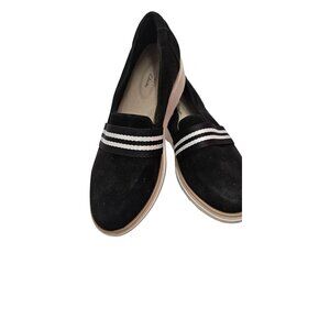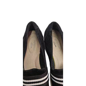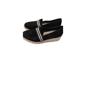 Comfortable slip-on Loafer shoes designed for women. Clark's Sharon Bay Collection. Features a cushioned sole for all-day wear and a stylish black suede upper.