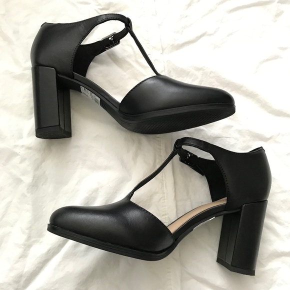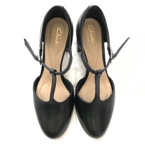 Clarks Freva85 T-Bar Black Pump Heels Leather Upper Size 6.5 Medium Width