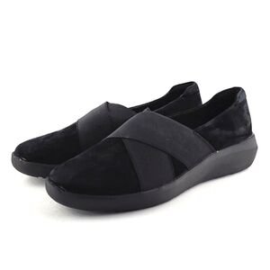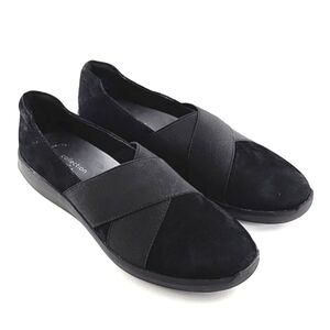 Excellent pre-owned condition, Clarks women's black lightweight, easy slip on flats sneaker shoes in a soft supple suede with two wide elasticized crossbands atop for a perfect fit, size 7.5M.