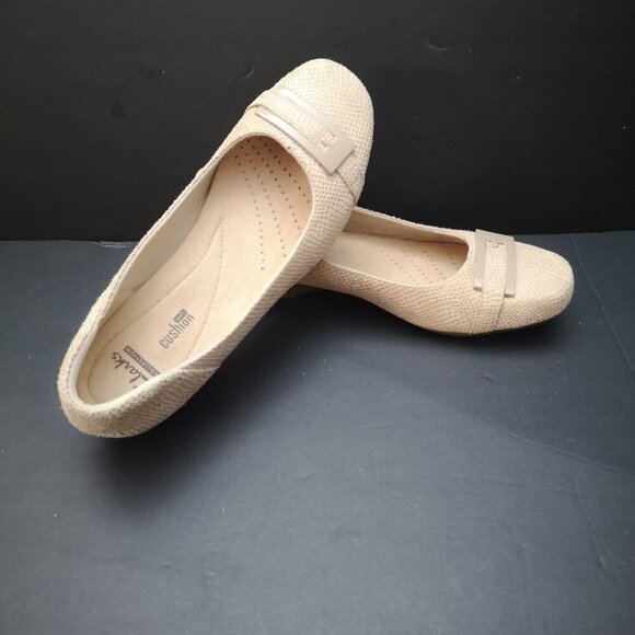 Clarks Ladies Size 7 Tan Snakeskin Faux Leather Brown Sole Flats