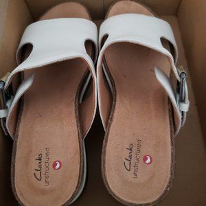 Clarks Lizby Ease wedge sandals, New in box. These sandals are soft and extremely comfortable, it breaks my heart to get rid of them, but they fit small. It says size 9, but fits more like 8 - 8.5. Every year I try them on to see if I would wear them, but my heels hang over, just a little, and I can't stand any kind of hang over, so I end up not wearing them.