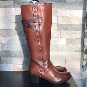 Antiqued studs and wraparound straps detail the shaft of a knee-high boot cast in premium Italian full-grain leather.