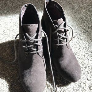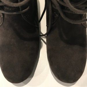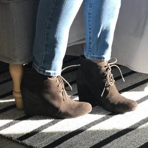 Clarks Artisan line suede wedge bootie. Leather suede upper, balance man made. Thin fabric lining. Heel measures 2 7/8". Rubber sole. Booties are in like new condition, No stains or signs of wear. Barely worn. Medium width.