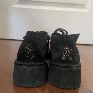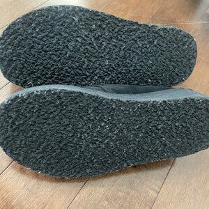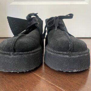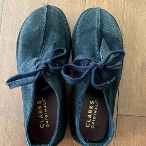 Lightweight, unlined, black suede upper, thick pebble crepe sole, 1.5” wedge, lace-up closure, 2 Clark’s Originals fobs, super comfortable, worn only a handful of times (all-black shoes just don’t suit me!), regular price $255 + tax