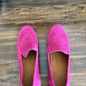 Clarks Trish Calla Mocassin Flats in Hot Pink (8.5 US, 6UK, 39EU). Flat shoes, brand new with tags, never worn, inbox. Lovely fuchsia color suede, with perforated pattern detail. Paid $120.00 plus tax. Asking $100.00. Really lovely shoes!