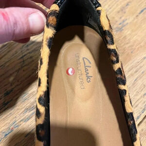 Chic and comfortable flats by Clarks from the Unstructured collection. Features a bold leopard print with shiny black patent accents on the toe and heel. Decorative buckle detail adds a stylish touch. Rubber soles show light wear; overall in great condition. Size US 7