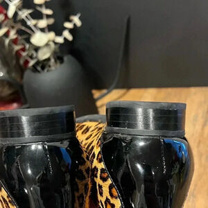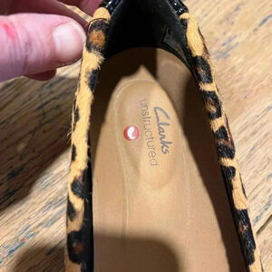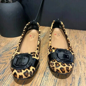 Chic and comfortable flats by Clarks from the Unstructured collection. Features a bold leopard print with shiny black patent accents on the toe and heel. Decorative buckle detail adds a stylish touch. Rubber soles show light wear; overall in great condition. Size US 7