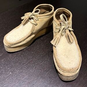 A modern take on the Wallaby Clarks Wallaby boot, with shearling trim on the front. Chunky sole.