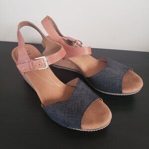 Mixed-texture sandal featuring woven-look toe strap and cork-wrapped wedge with contrast stitching at platform