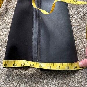 Gently worn. WIDE CALF. 19" calf circumference and the back panel has a bit of stretch to it. Size 9.5 regular width (M). 18" tall in the front, 17" tall in the back. Rear belt detail.