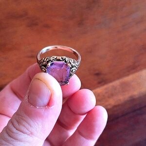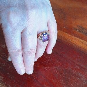 This exquisite ring features a stunning purple gemstone set in a beautifully crafted 18K gold plated stainless steel band. Perfect for adding a touch of elegance to any outfit.