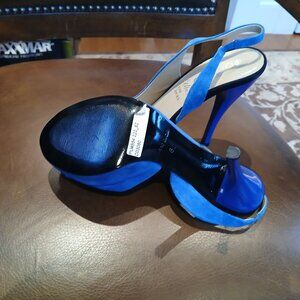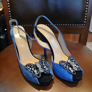 These beautiful Ulas Fine Shoes product are all blue suede leather, a padded footbed, and synthetic outsole. New and unworn, and handmade in Europe. Size 37 only.Interesting jewelled butterfly applique on the toe.