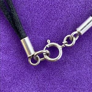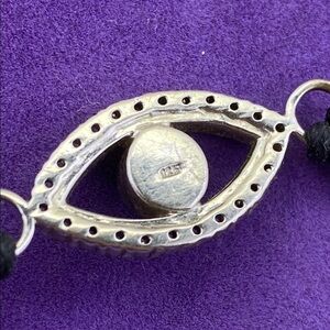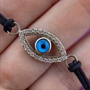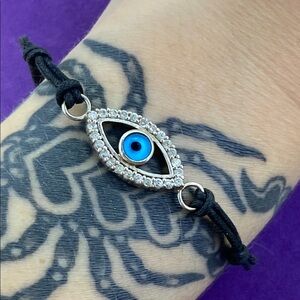 This elegant bracelet features a striking evil eye design, set against a black band with shimmering silver accents. Perfect for adding a touch of mystique to any outfit.
