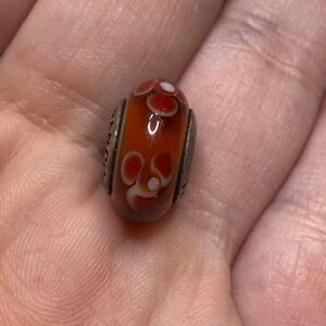 A Dark Cinnamon color with a 3 petal white and red flower design spaced apart on this glass charm. Authentic Pandora Slide Charm.